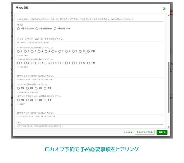 予約の申し込み時点で必要な項目を記入してもらえるので、こちらが最初から一つずつ確認しなくても進めやすくなりました。オーダーケーキは色やイメージなど確認事項が多いのですが、予約サイトに「どんな思い出か」といった項目があり、そこに書いてもらえるのも助かっています。
