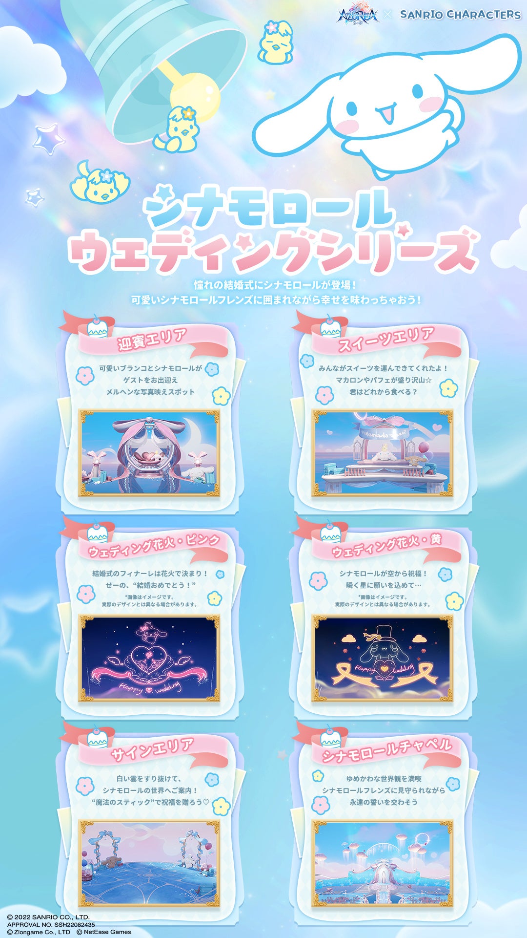 結婚機能の実装とともに、シナモロールテーマのウェディングドレスやタキシードが実装されます。華やかな結婚式にシナモロールたちの愛くるしさをプラスすれば、きっと忘れられない式を挙げることができるでしょう。シナモロールとともに思い出作りをしてみては如何でしょうか?