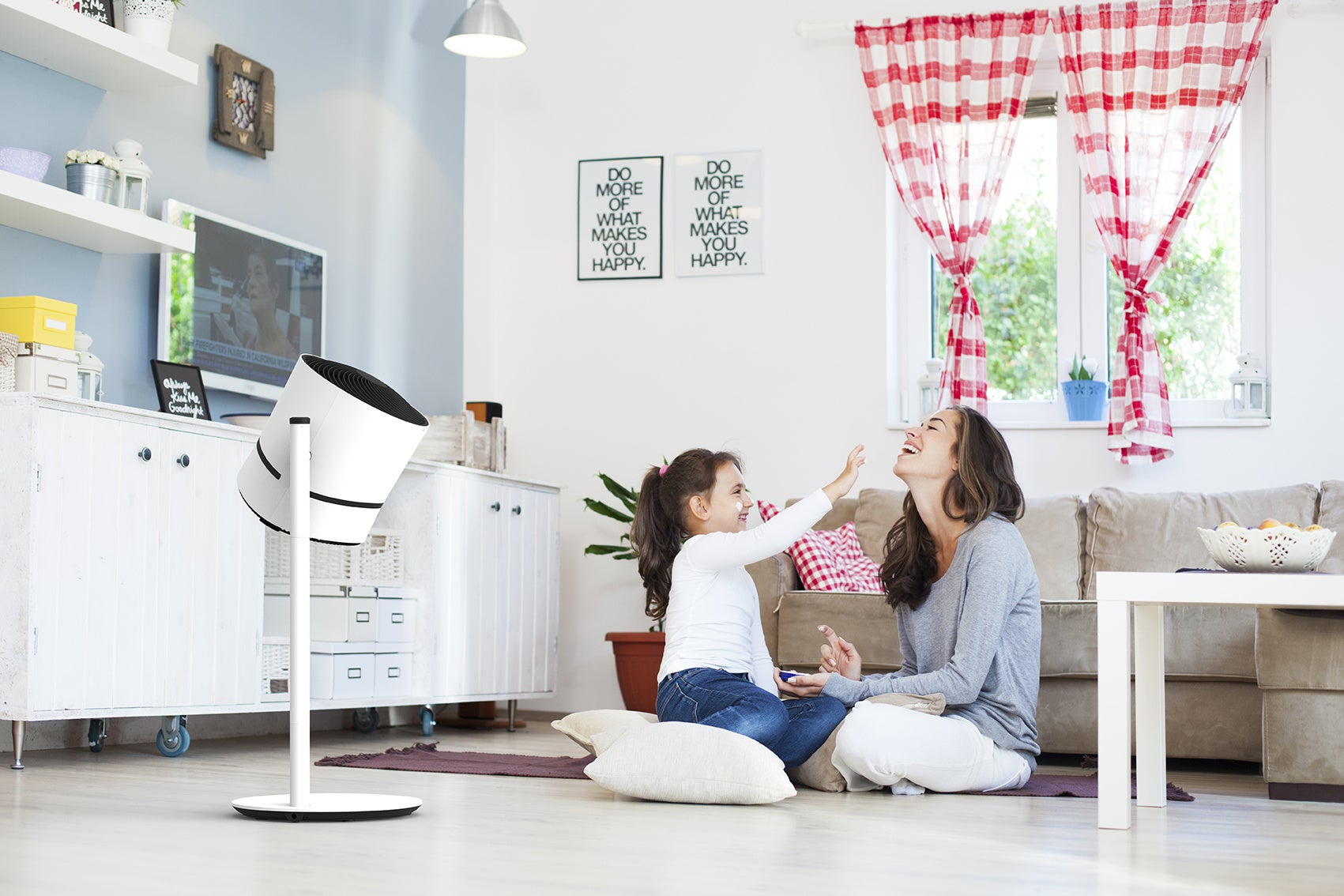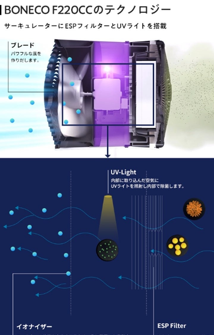 「BONECO F220CC Clean & Cool Fan」は、サーキュレーターと空気清浄機が一体となった2in1タイプ。ESPフィルターにより空気中の粒子を捕集するとともに、内部に取り込んだ空気をUV-Cライトで除菌し、キレイになった空気を強力なファンで室内のすみずみまで循環することで、より早く効率的に室内の空気の質を高めます。