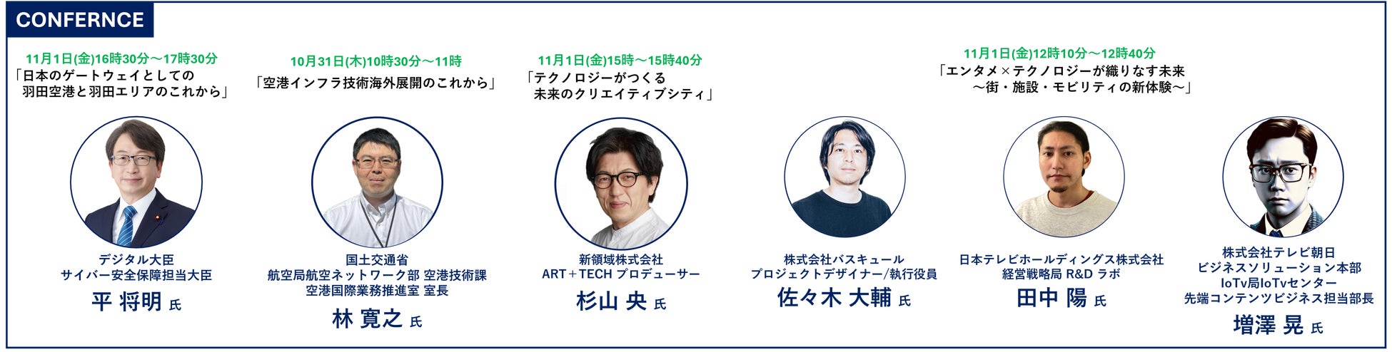 また、カンファレンスプログラムでは、デジタル大臣・サイバー安全保障担当大臣の平将明氏や、国土交通省の林寛之氏をはじめ、各分野のエキスパートがHANEDA EXPO 2024で登壇します!
