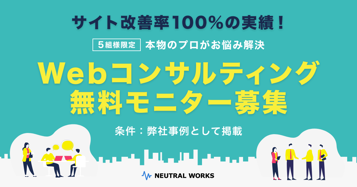 サイト制作からマーケティングまで一気通貫で支援するニュートラルワークスが提供する「Webサイト改善コンサルティング( https://n-works.link/web-consulting )」を、初月無料で体験できる、モニターを募集いたします。