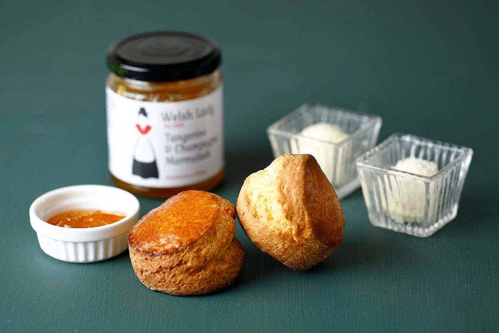3段スタンドの下段に並ぶのは、アフタヌーンティーに欠かせないスコーン。イギリス産小麦で焼き上げ、小麦本来の風味や香りをしっかり感じられるのが特徴。国産よりも挽きが荒く灰分が多いことからミネラルが豊富で、イギリス菓子特有のさっくり、ほろほろ食感が楽しめます。ウェールズ産マーマレードとクロテッドクリームとの相性が抜群です。