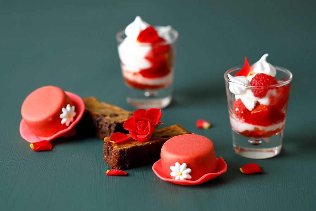 そして、在位70周年を祝し考案したサクランボ色が目を引く帽子型のケーキ「ザ・クイーンズ・コレクション~女王陛下のお気に入り~」。ビクトリア・スポンジケーキをベースに、ベリーのジャムとバタークリームを中に閉じ込め、苺のチョコレートでグラサージュ(コーティング)した、シェフパティシエール自慢の逸品。
