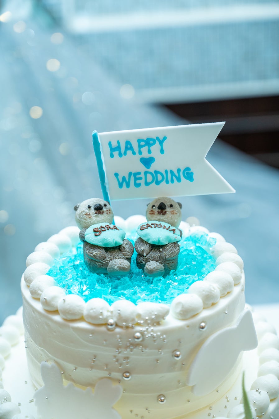また、鳥羽国際ホテルでは、全ての披露宴会場から海を望むことができ、さらにはブルーを基調にしたテーブルコーディネートや、ラッコをあしらったウエディングケーキ、サンクスグッズには、ポケットモンスターのキャラクターでラッコポケモンに分類される「ミジュマル」とコラボした鳥羽国際ホテルオリジナルのミジュマルのみえマイヤーレモンチーズケーキを利用するなど、「海」にこだわった演出を提案させていただきます。