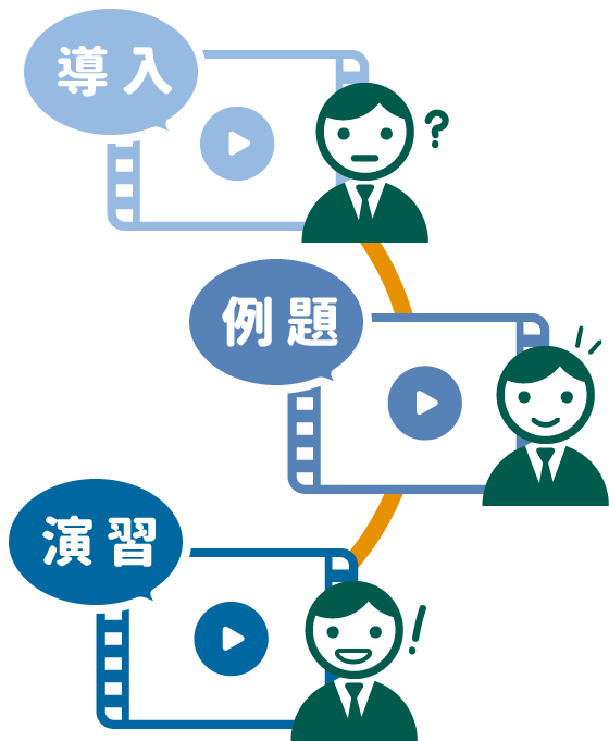 解説動画は、導入部分、演習問題それぞれに用意。疑問に思った部分の動画を、ピンポイントで視聴でき、わからない部分だけを何度も見返すことで、時間がなくても効率的に学習できます。