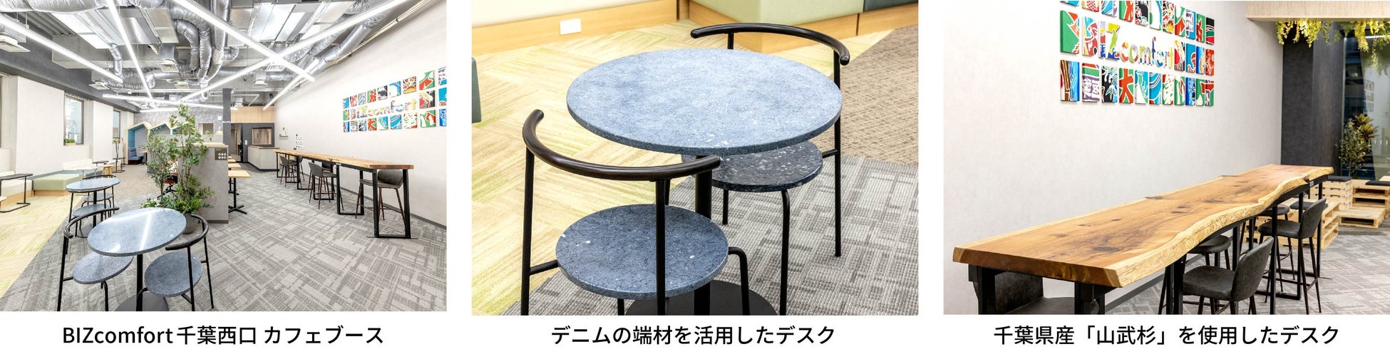 千葉市が市制100周年を迎え、駅前に再開発が進む中「ペリエ+plusビル」の1F~3Fに『BIZcomfort千葉西口』は出店しました。当施設は、内装や設備に千葉県産の「山武杉」やリサイクル素材を取り入れ、今後100年に向けて人にも環境にも優しい「サステナブルなシェアオフィス」を目指しました。「空室再生」と並び、社会課題の解決に貢献するシェアオフィスのひとつとなりました。
