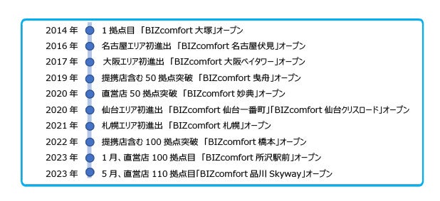 2023年『BIZcomfort』は、埼玉県所沢市にオープンした『BIZcomfort所沢駅前』を以って、直営店全国100拠点目を達成することができました。その後も、絶え間なくオープンを迎えることができ、2023年5月1日には直 営店110拠点目となる『BIZcomfort品川Skyway』が誕生しました。
