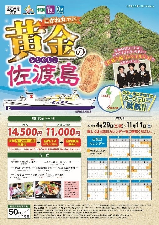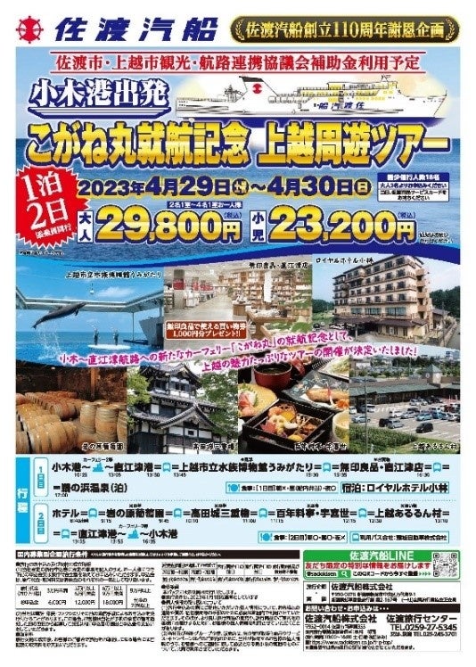 【佐渡汽船】4月29日小木~直江津航路カーフェリー「こがね丸」就航記念ツアー発売