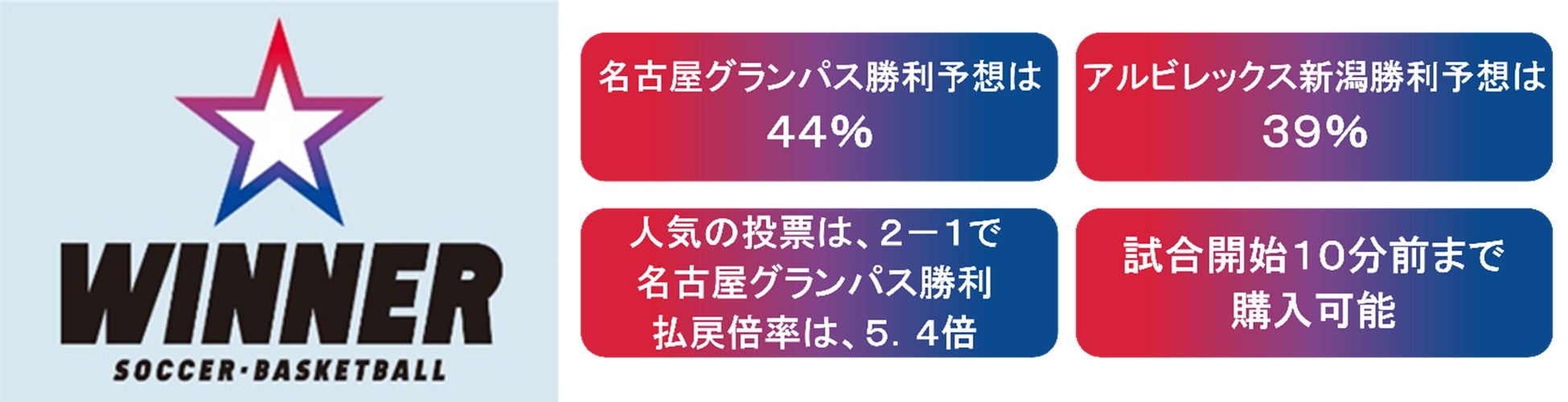 なお、「WINNERサッカー1試合予想(名古屋グランパス vs アルビレックス新潟)」は、11月2日(土)12時55分まで販売いたします*。国立競技場で開催されるルヴァンカップ決勝を「WINNER」と併せてぜひお楽しみください。
