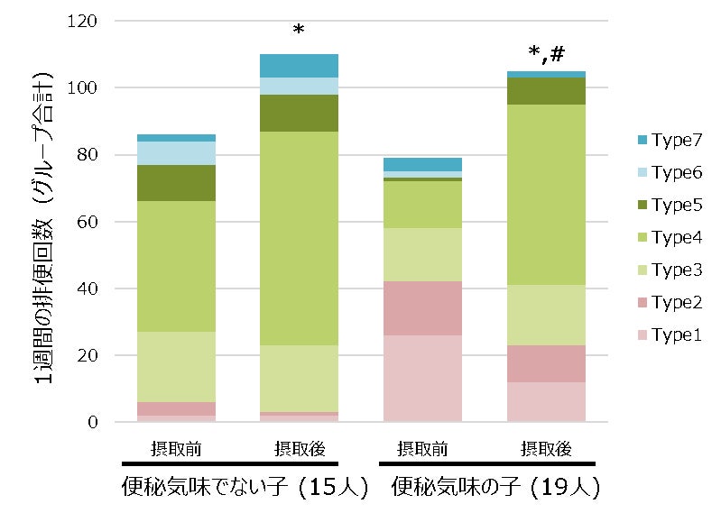 便秘症の診断基準(2)には、自然排便回数が週3回未満、排便時の25%以上が硬い便であることが挙げられています。この2つの症状の少なくとも一方に当てはまる子どもを便秘気味であるとしたときに、もち麦を摂取していない1週間において便秘気味の子どもが19人いました。1週間のもち麦摂取により、便秘気味の子どもは7人に減少し、便秘の症状が改善することが明らかとなりました(図3, p<0.05 カイ二乗検定)。最初の1週間に便秘気味でない子ども(15人)と便秘気味の子ども(19人)のグループに分けて排便回数と便の形状を解析したところ、どちらのグループでも排便回数が増加しました(図4, *:p<0.05 対応のあるt検定)。さらに、便秘気味の子どものグループでは硬い便(Type1、2)の割合が減少し、健康な便(Type3~5)の割合が増加していました(図4, #:p<0.05 カイ二乗検定)。