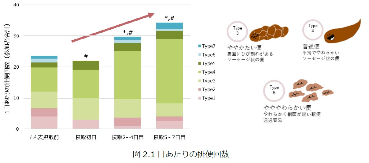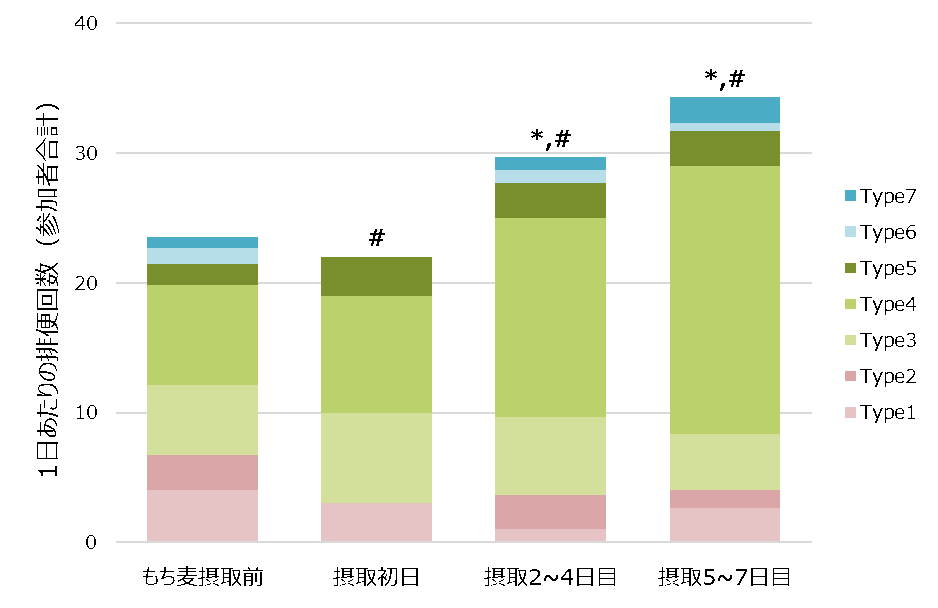 もち麦を摂取していない期間に比べて、もち麦の摂取開始から2~4日目、5~7日目では1日あたりの平均排便回数が増加しました(図2,*: p<0.05 対応のあるt検定)。この排便回数の増加は健康な便(Type3~5)の増加に起因していました(図2, #:p<0.05 カイ二乗検定)。