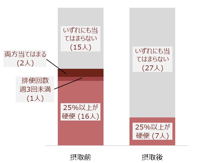 もち麦には不溶性食物繊維と水溶性食物繊維の両方がバランスよく含まれています。不溶性食物繊維は腸を刺激して腸の蠕動(ぜんどう)運動を活発にすることで腸内の不要物の排泄を促進、排便回数を増加させます。また、水溶性食物繊維は保水力があるため便を柔らかくすることで正常な便の排泄に寄与し、総合的に便秘症状の改善がみられたと考えます。