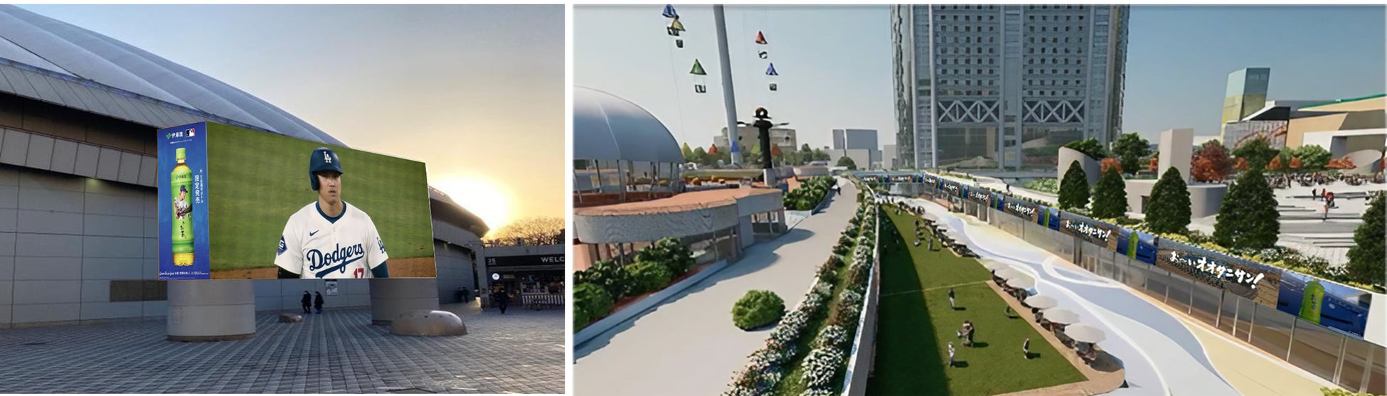 MLB™ TOKYO SERIES presented by Guggenheimが開催される3月14日(金)〜19日(水)の期間、東京ドームシティ内の広告メディアをジャックして、大谷翔平選手を起用したCMやキービジュアルが全9カ所で掲出され、MLB™ TOKYO SERIESを盛り上げます。特に、東京ドームへの玄関口となる25ゲート広場の大型サイネージビジョンやプリズムホール、駅ビル、ラクーアの主要ビジョンをジャック。さらに、東京ドームシティのアベニューエリアをジャックし、CMだけでなく大谷選手の「お〜いお茶」の愛飲コメントを放映します。観戦にお越しいただく皆様にインパクトを与えること間違いなしです。