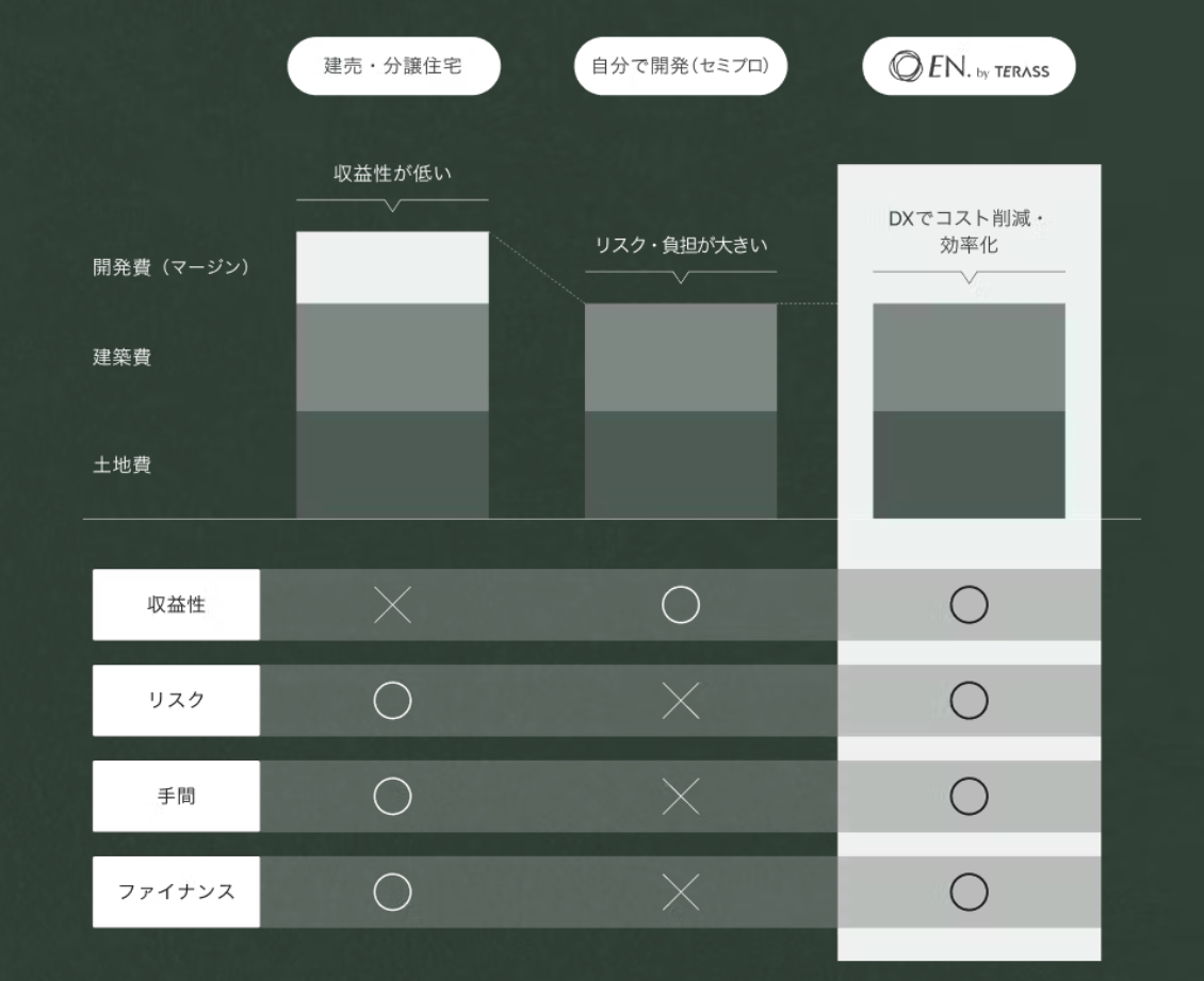 今回新たに提供を開始した「EN. by TERASS」は、Build to Rent(受注建築)型により収益性を高めた、デザイン性の高い投資用木造アパート建築サービスです。既存の投資物件を「買う」のではなく、土地探しから始まり、建築家・入居者との縁をつなぎ、資産として“育てていく”不動産所有を実現します。