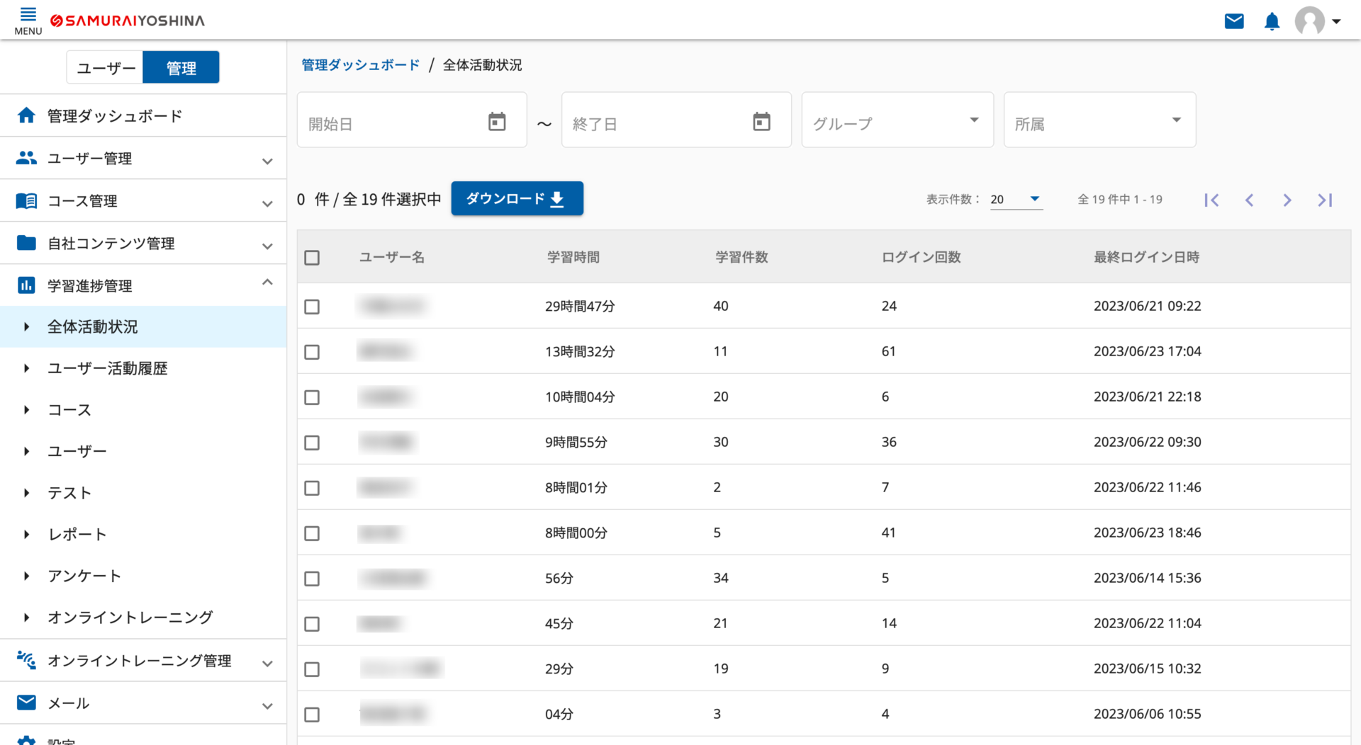 「誰が何時間学習をしているのか、どの教材を学習していたのか、テストの進捗や定着レベルはどの程度なのか」などを管理画面で簡単に把握することができます。管理が簡単だからこそ、社員の研修状態に問題があればすぐにアプローチすることが可能です。