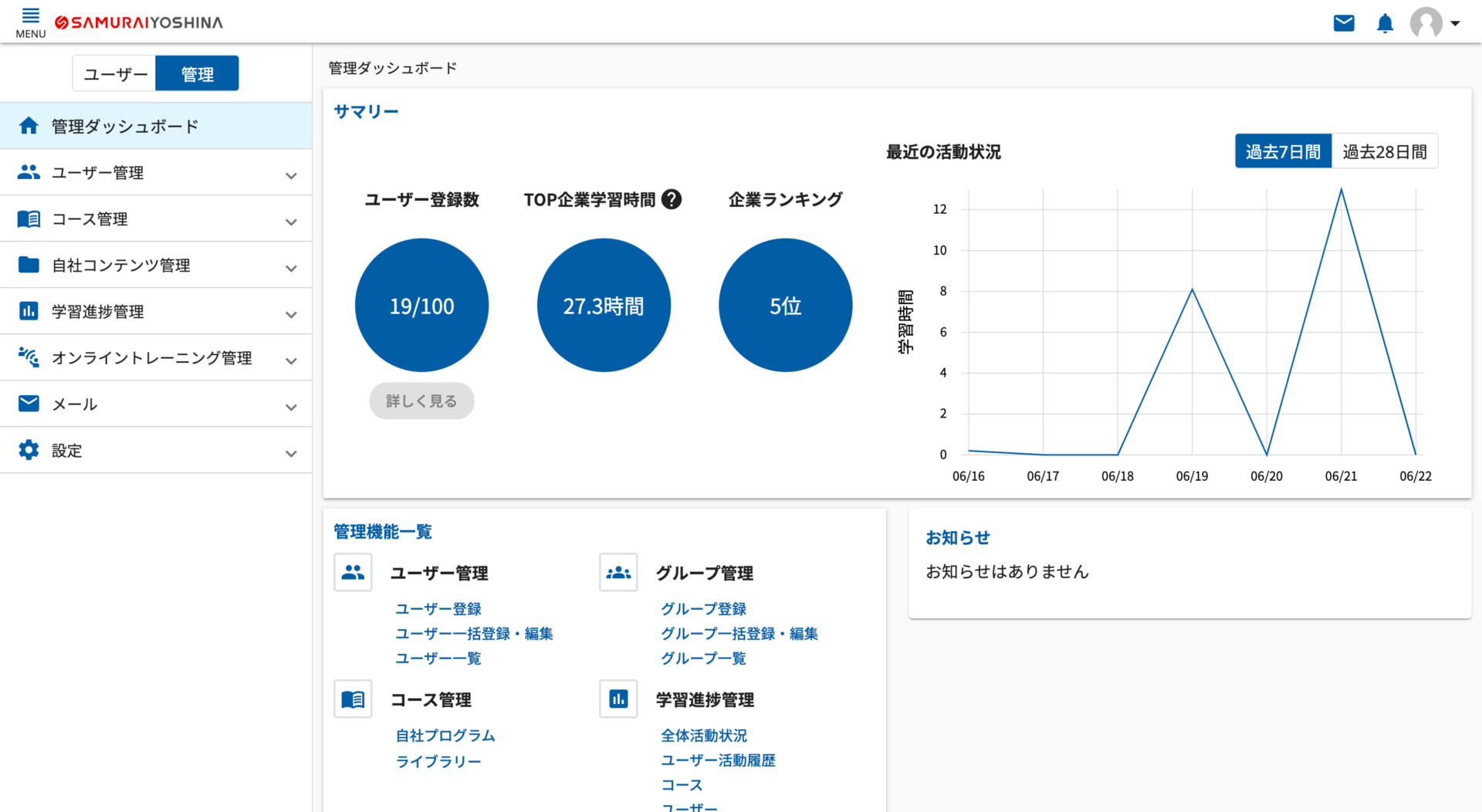 「SAMURAI YOSHINA」は、累計指導実績35,000人以上(※)のプログラミングスクールを運営する当社のノウハウを活かし、オンボーディングからトレーニング、デジタル人材育成に至るまで、すべての社員教育を「eラーニング」で実現するサービスです。