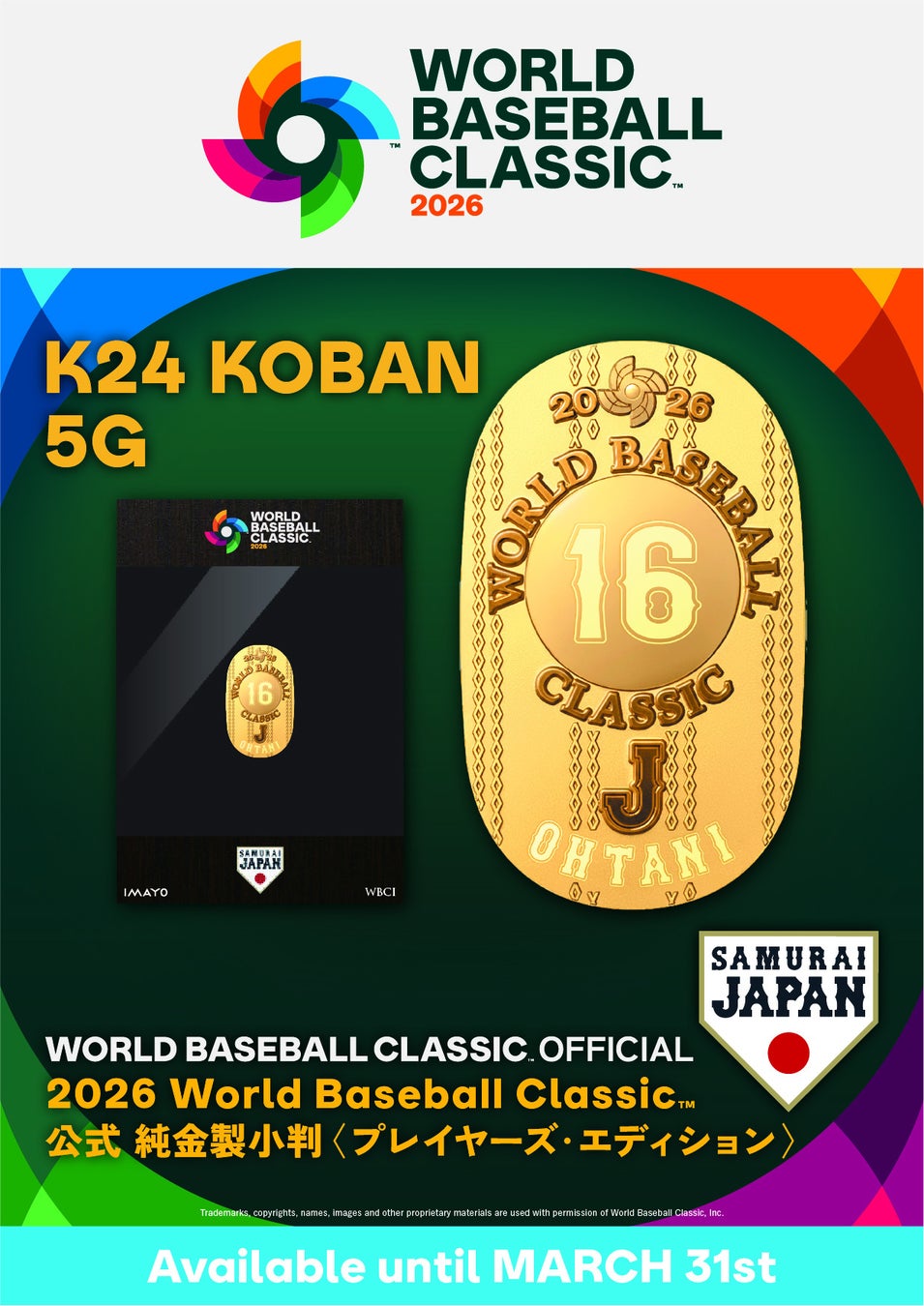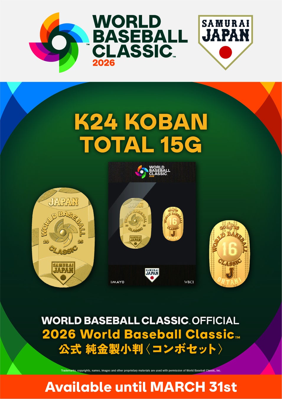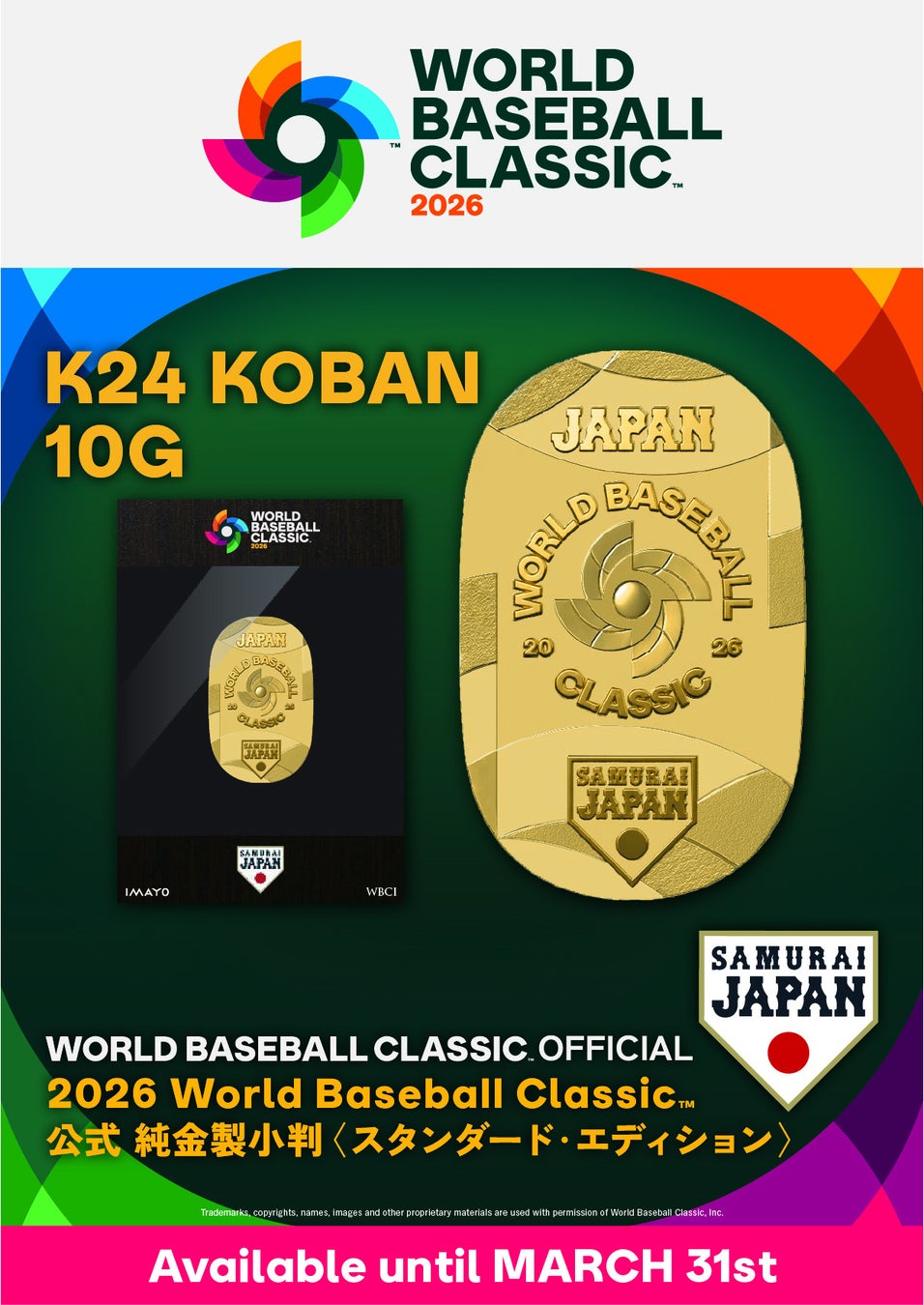 「2026 World Baseball Classic 公式 純金製小判」が、IMAYO 取扱店舗および公式オンラインショップ 他 にて 2026年3月31日までの期間限定受注販売