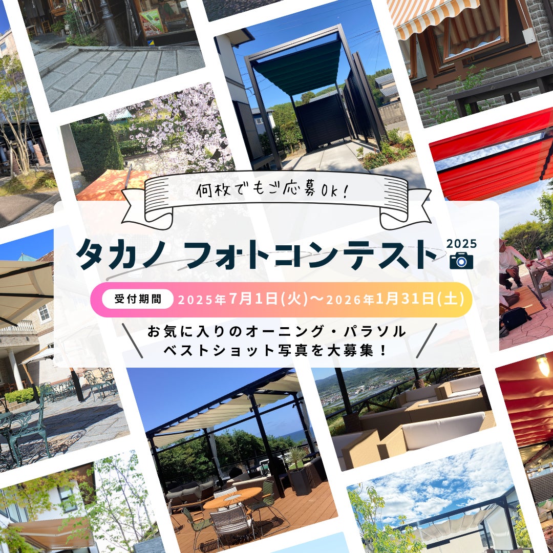 タカノ株式会社(本社:長野県上伊那郡宮田村、代表取締役社長:鷹野 雅央)は、タカノのオーニング・パラソル製品を使用した施工写真で競う「タカノ フォトコンテスト2025」を開催し、2025年7月1日(火)~2026年1月31日(土)まで作品を募集します。