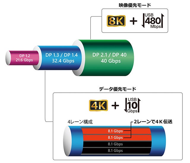 ・映像:DP2.1(4レーン8K) + データ:USB 2.0(480Mbps)