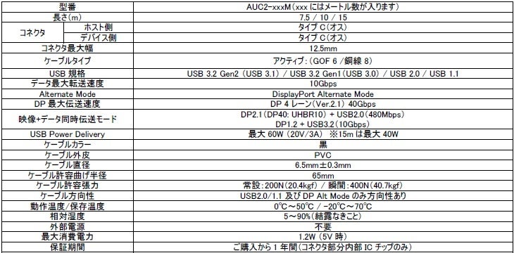株式会社エーディテクノ(東京都千代田区)は、DP Alt Mode(DisplayPort Alternate Mode)とUSB 3.2 10Gデータ、およびPower Deliveryに対応した長尺光ファイバUSB-Cケーブル[AUC2]シリーズ から、7.5m「型番:AUC2-007M]、10m「型番:AUC2-010M」、15m「型番:AUC2-015M」の3ラインナップを2025年8月26日(火)より発売いたします。
