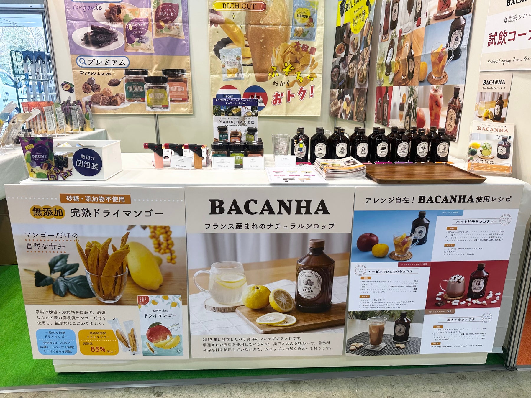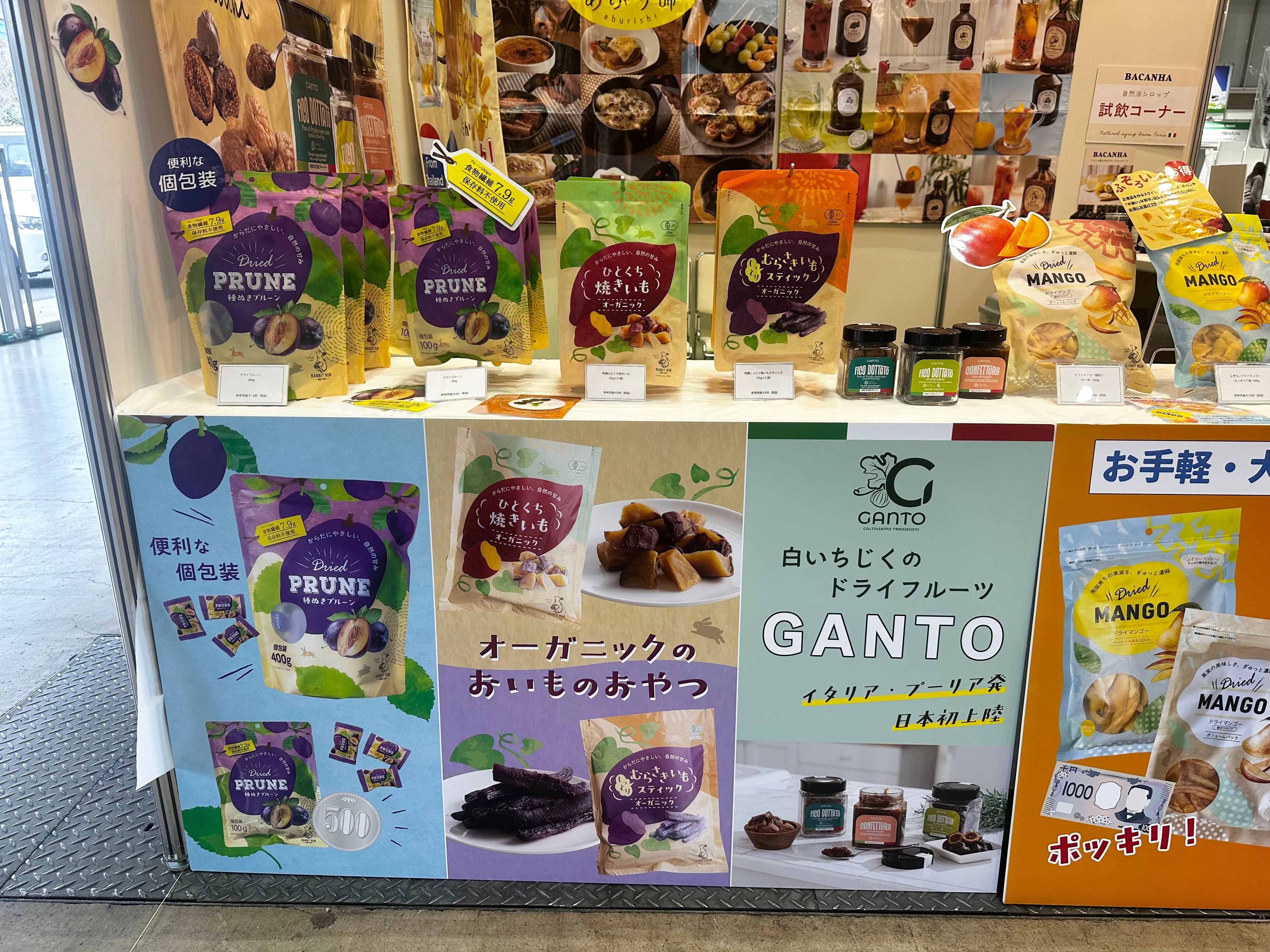 今回のブースでは、フランス発の高品質シロップブランド「BACANHA(バカンハ)」、イタリア・プーリア州発の白いちじくブランド「GANTO(ガント)」、砂糖・食品添加物を一切使用しない「無添加 完熟ドライマンゴー」、最高級ダジャン種プルーンを使用した「ドライプルーン」、オーガニックのお芋から作られた3種類のおやつ、さらに使いきりクッキングバーナーの「あぶり師」をご紹介。多くのお客様に関心をお寄せいただきました。