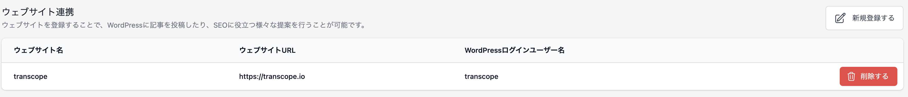 Transcopeの[設定]メニューの[ウェブサイト連携]セクションから、WordPressの情報をご入力いただけましたら幸いです。