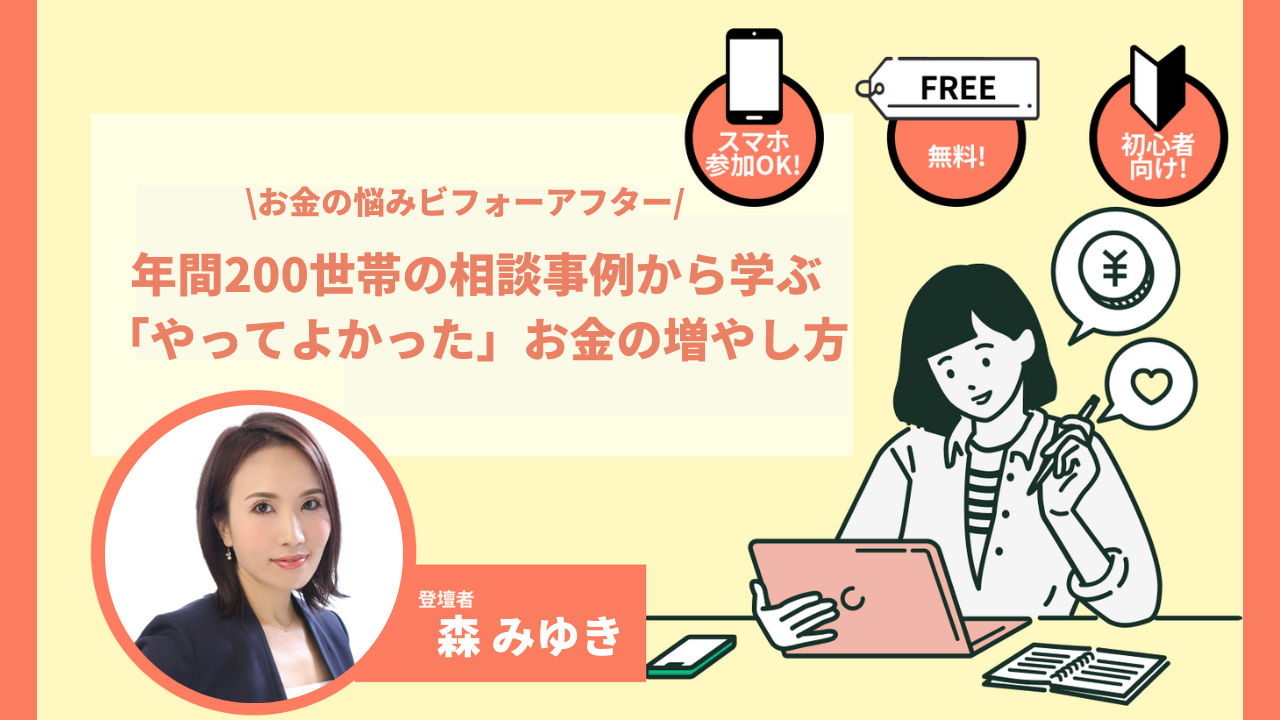 当日は、お金に関する相談を年間200件以上受けている経験豊富な講師の森 みゆき様(カスタマーリンクス)を迎えて「年間200世帯の相談事例から学ぶ”やってよかった”お金の増やし方」に関するオンラインセミナーを実施いたしました。