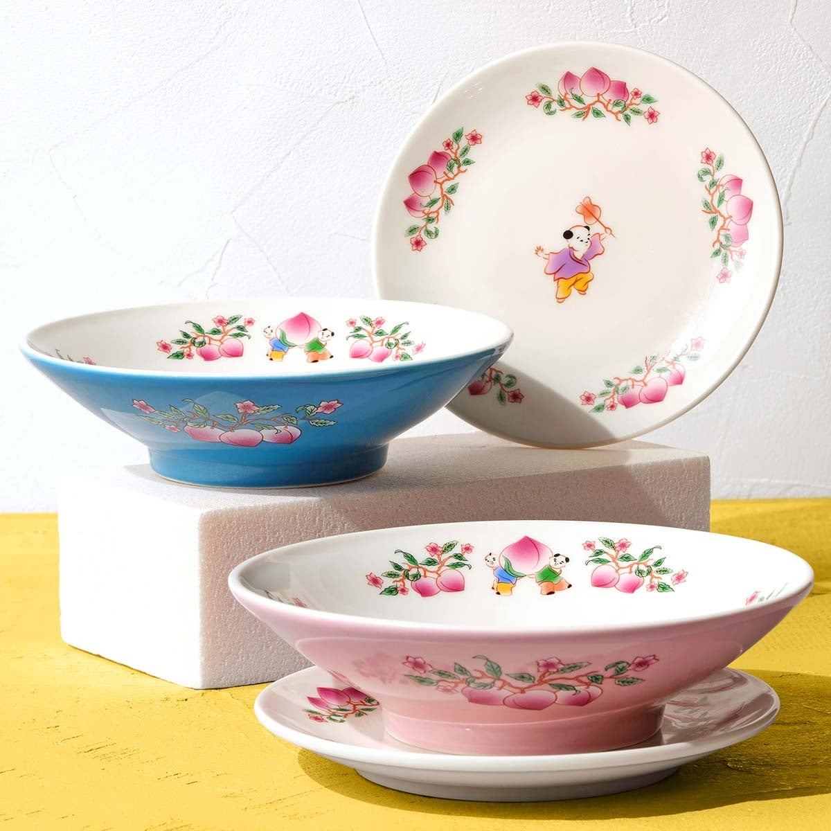 商品名:オリジナル 桃と唐子のレトロ皿セット(藍色/桃色)