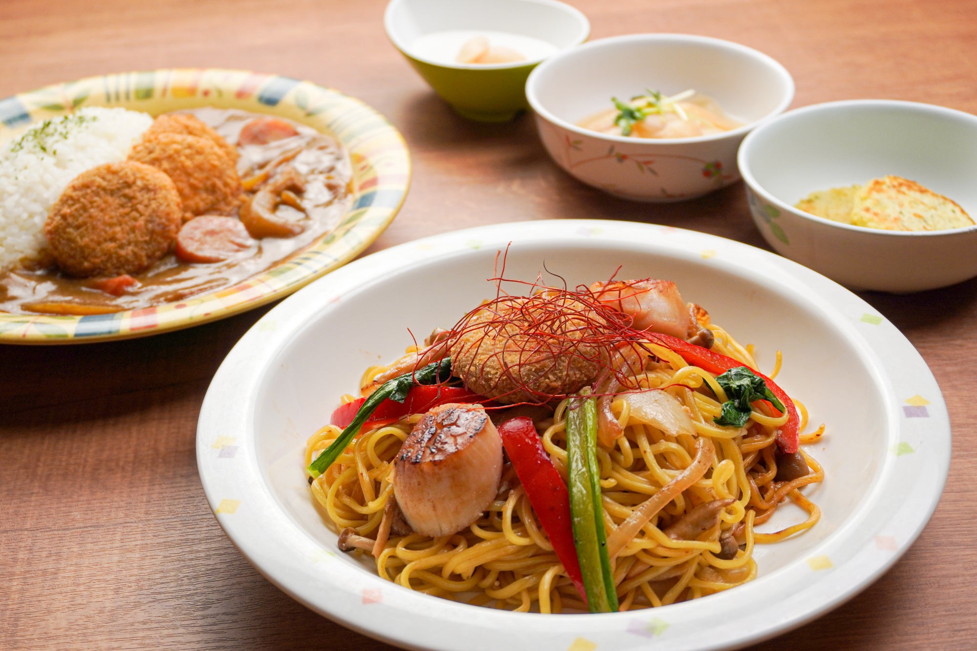そんな北見市の特産品は、生産量・出荷量ともに日本一の玉ねぎや白花豆をはじめ、養殖技術の発祥地といわれているホタテなど、農業・漁業ともに盛んです。今回は「オホーツク 北見塩やきそば」や「北見のごちそうたまコロカレー」など、出来るだけ北見市の魅力をた くさん盛り込んだメニューをご用意致しました。