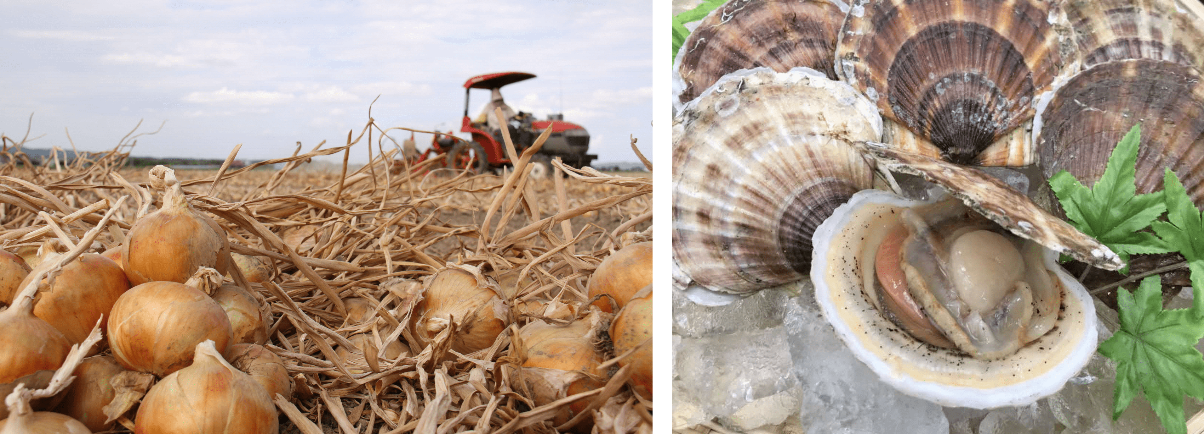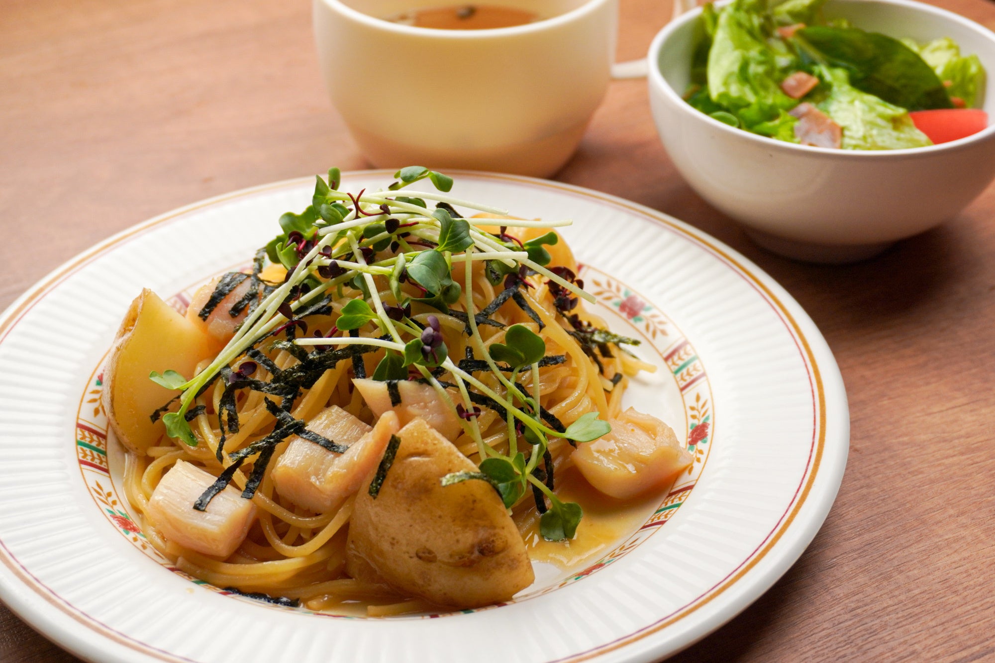 オホーツク産ホタテと、旬を迎えるスノーマーチをじっくり炒めた玉ねぎ醤油ソースで和 風パスタに仕上げました。豊かな海で育ったホタテは最高品質として知られ、獲る漁業から 育てる漁業へ、ホタテ増養殖技術の発祥地でもあります。