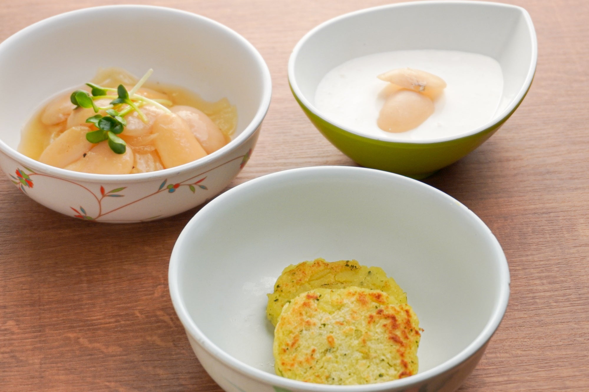 (左から)やわらかく煮込まれた白花豆の甘煮、白花豆の食感を残したムース、じゃがいももち