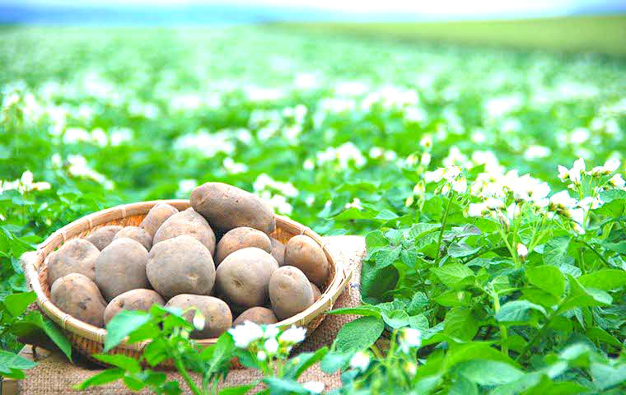 北見じゃがいもの新しい顔「スノーマーチ」は、2004 年に開発されました。 雪のように白い果肉は、しっとり甘く滑らかな食感 で、煮崩れがしにくいので調理がしやすい品種。 寒さが厳しくなる 12 ⽉頃からでんぷん質が少しずつ 「糖」へと変わり、他の種類のじゃがいもよりも甘み と風味が増していく、まさに「冬」が旬のじゃがいも です。