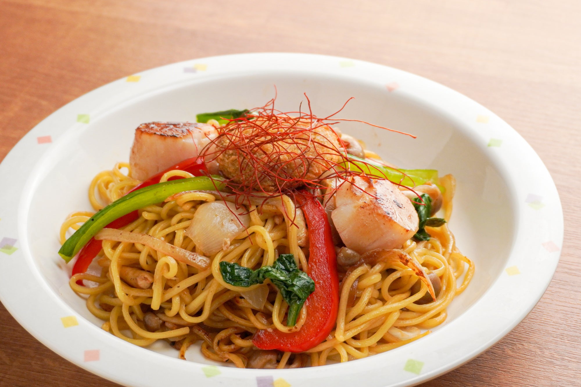北見玉ねぎ・オホーツク産のホタテ・もちもち食感の道産小麦麺を特製塩だれで炒めた北見市のご当地やきそば。食べると濃厚な旨みが広がり箸が止まりません!