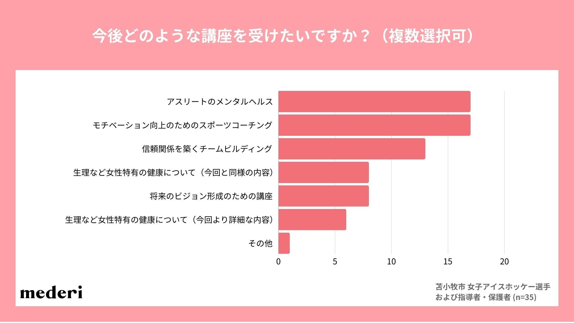 「メンタルヘルス」「モチベーション向上」「チームビルディング」といった、精神面やコミュニケーション面での関心度・学習意欲が高いことから、アスリートにとって心身両面での継続的なサポートやケアが重要であると言えます。