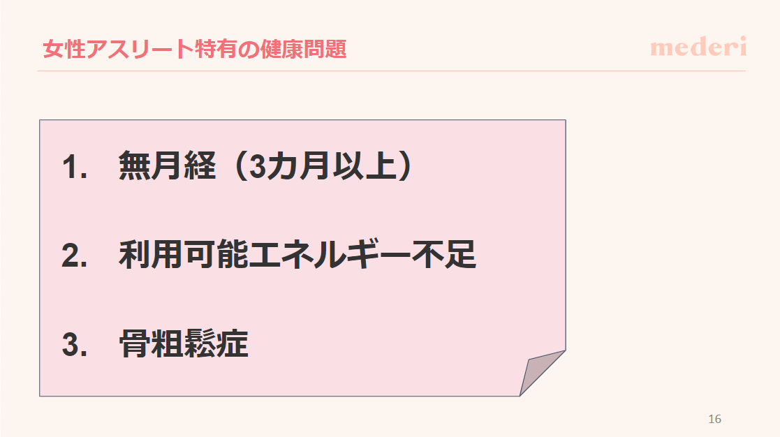 加えて、アスリート特有の健康問題として、無月経・利用可能エネルギー不足・骨粗鬆症とそのリスクを紹介しました。なかでも無月経には特に注意が必要であり、3カ月以上月経がない場合には医療機関への受診を推奨していることや、骨粗鬆症のリスクも高まるため適切な栄養補給と体重管理が重要になる点を強調しました。
