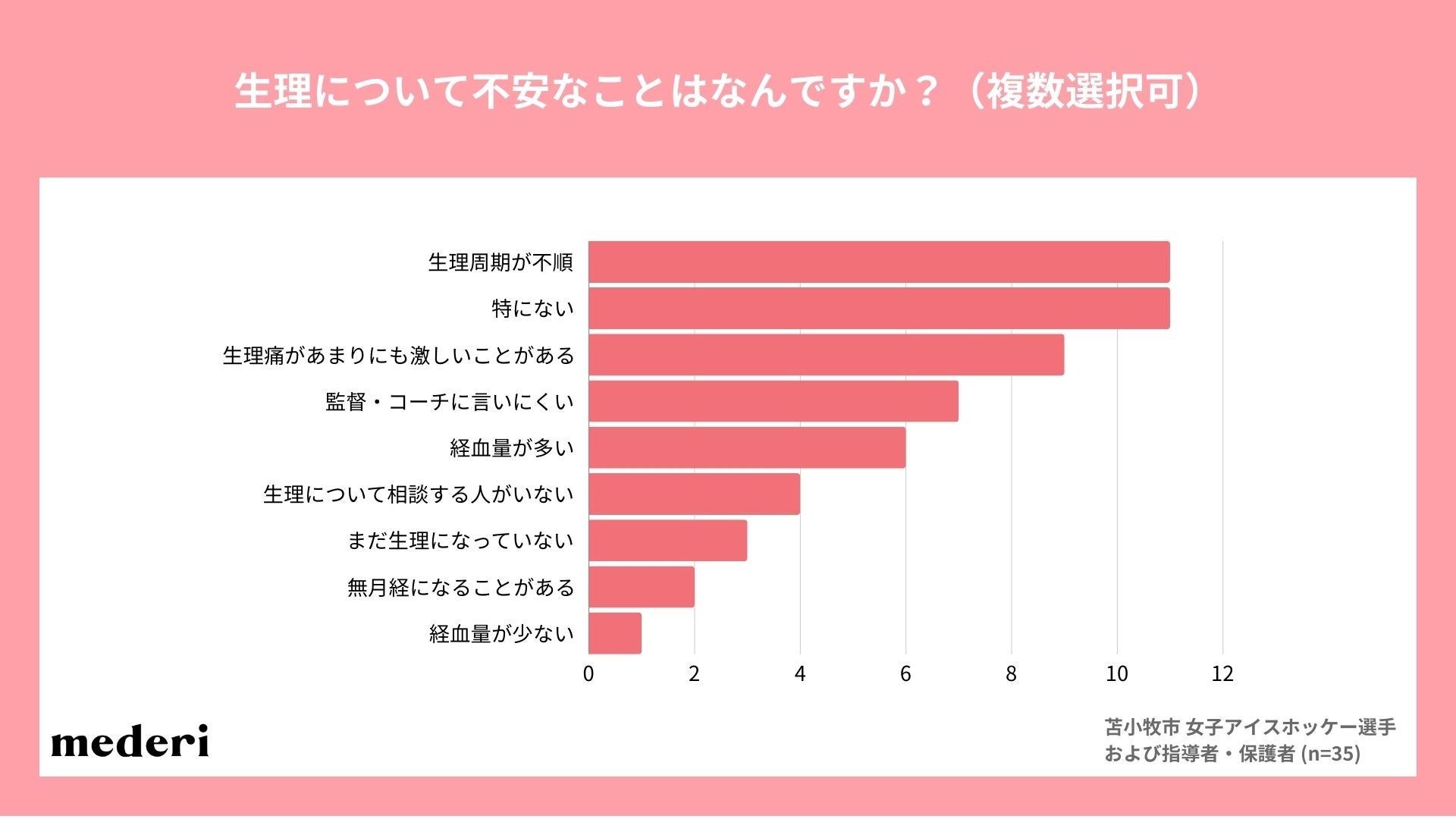 生理そのものの身体的な症状に加えて、「監督・コーチに言いにくい」「生理について相談する人がいない」といったコミュニケーション面での不安を感じている様子が読み取れます。