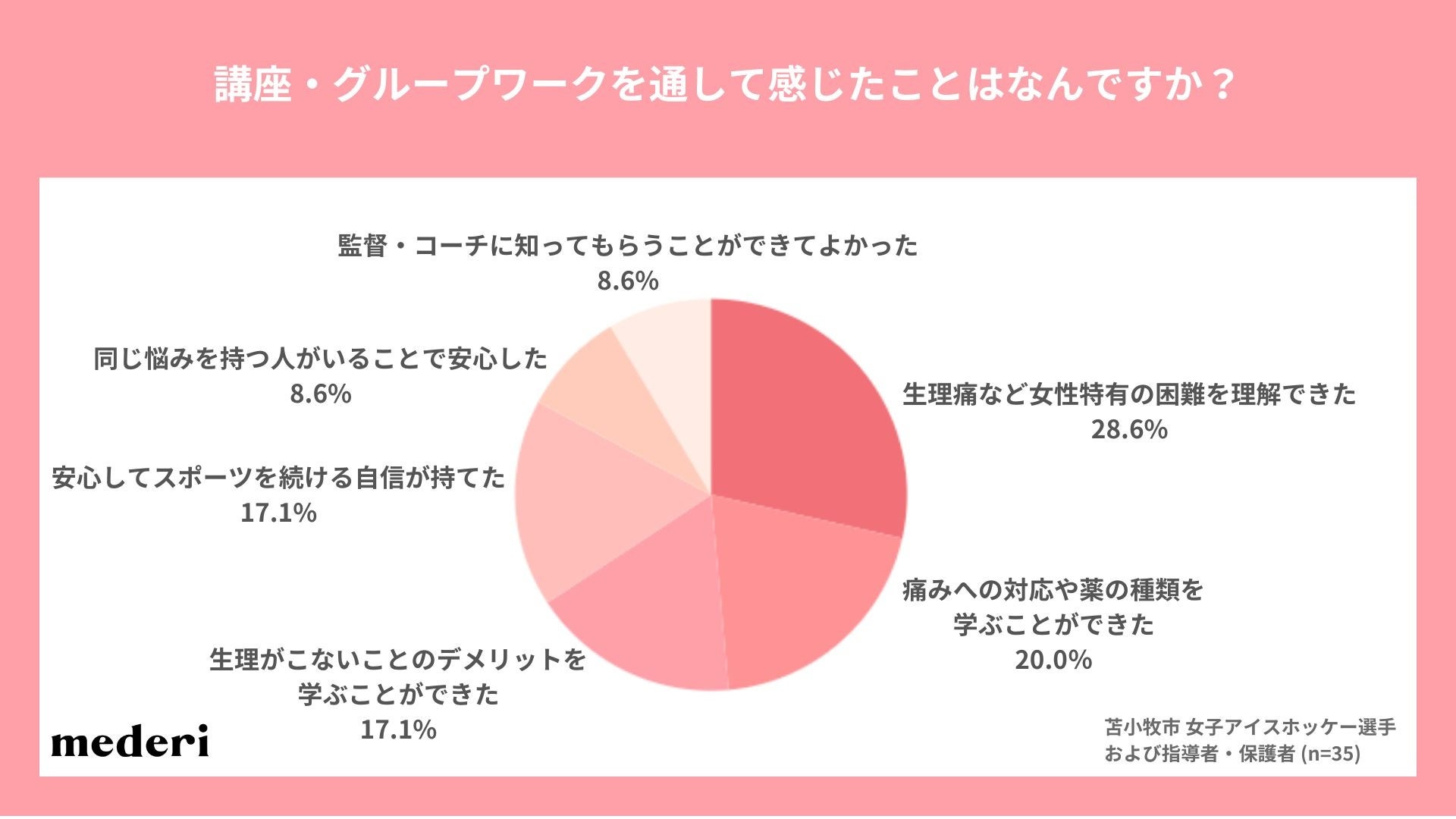 mederiでは、苫小牧市が掲げる「誰もが生き生きと暮らすことができる地域社会」の実現に向けて引き続きさまざまな取組みを行うとともに、あらゆる年代の男女へ向けて、生理/PMSに対する正しい理解や、ご自身の身体に合わせた選択肢の提供を目指して、女性の健康課題や性教育に関するセミナー活動を実施していく予定です。今後もオンラインピル診療サービス『mederi Pill』をはじめ、展開するさまざまなサービスを通して「女性の生きやすさ」の実現を目指してまいります。