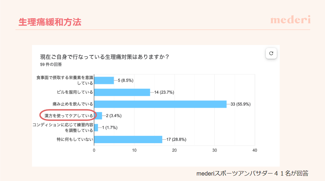 生理痛の悩みについては、一般的な痛み止めのほかに、低用量ピルや漢方薬の使用を紹介しました。痛み止めの服用タイミングについても、痛みの症状が感じられる前に服用するのがより効果的であると説明。また、漢方薬については、ドーピングに注意が必要であり、適切な使用が求められることをアスリートにとっての注意点として加えました。