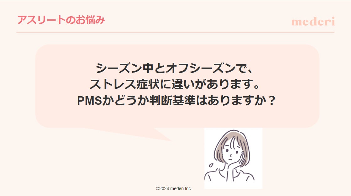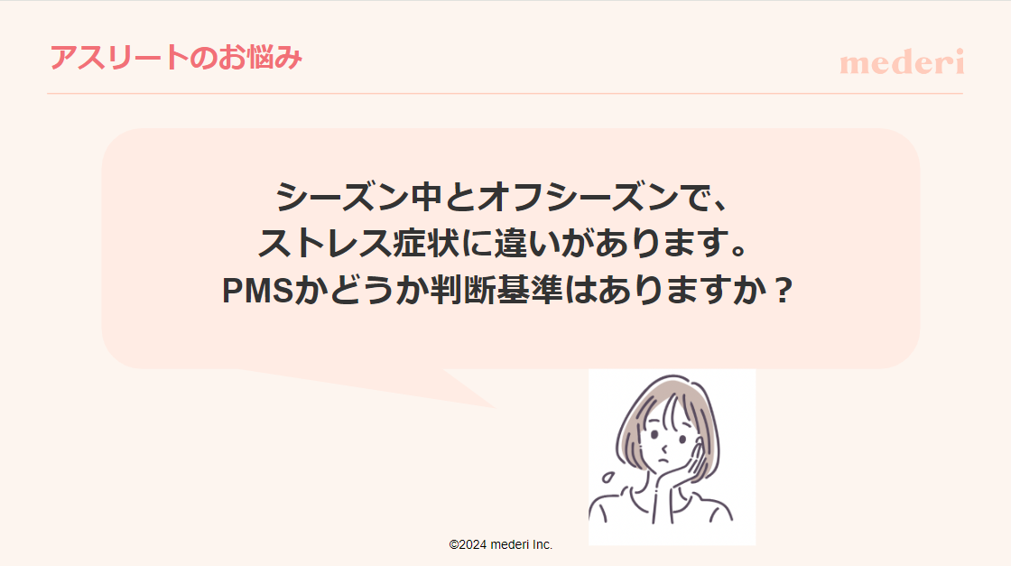 続いて、「アスリートの悩みと解決策」に関するパートでは、参加者である選手たちの日頃の悩みを払拭できるよう具体的なアドバイスを交えながら解説。『シーズン中とオフシーズンで、ストレス症状に違いがあり、PMS(生理前症候群)かどうか判断基準はありますか?』という悩みについては、PMSが女性ホルモンの急激な変動によって引き起こされると考えられており、PMSにともなう身体的および精神的な不調への対策方法として、規則正しい生活やバランスの取れた食事、適度な運動などが大切であることをお伝えしました。