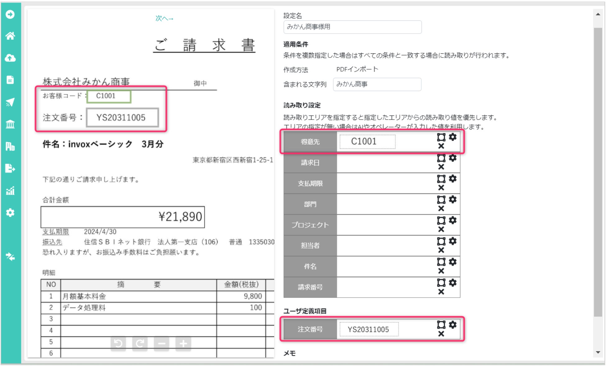 invox発行請求書にアップロードいただいたPDFに対し、ユーザー様が読み取る対象の項目を設定することで、条件に合致したPDFを定義したレイアウト通りにデータ化することができます。