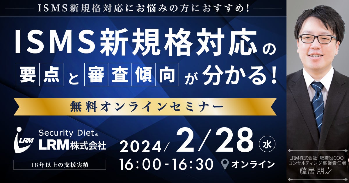 LRM株式会社(以下LRM、本社:兵庫県神戸市、代表取締役CEO:幸松哲也)は、2024年2月28日(水)に、「ISMS新規格対応の要点と審査傾向が分かる」無料オンラインセミナーを開催いたします。
