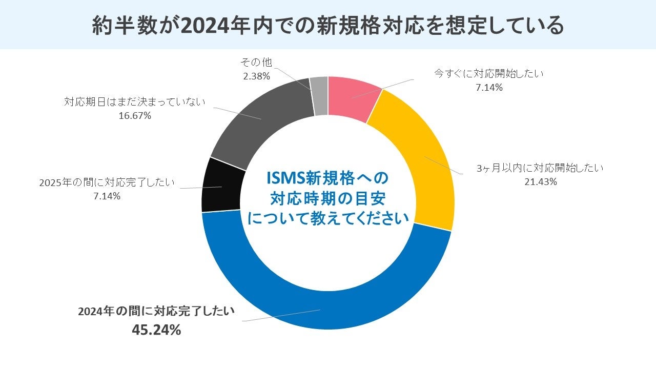これまで当社では、ISMS新規格対応に関するセミナーを10回以上実施しており、セミナー参加者様へ実施したアンケートによると、ISMS新規格対応はまだ着手できていないと回答した方のうち、45%の方が「2024年の間に対応完了したい」と回答されています。