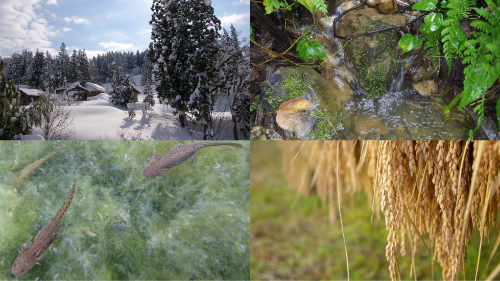 新潟県十日町市の山間にある池谷・入山集落は、全国的に有名な「魚沼産コシヒカリ」の産地です。冬になると、3メートル以上雪が積もり春になると解けた水が大地にゆっくり浸透し、ミネラルをたっぷり含んで田んぼに注がれます。 田んぼにはカエルやどじょう、水生昆虫など生き物が沢山棲んでいます。初夏にはホタルも飛び交い、そして山地だからこそ、昼夜の寒暖差によりお米の甘味がぎゅっと増します。
