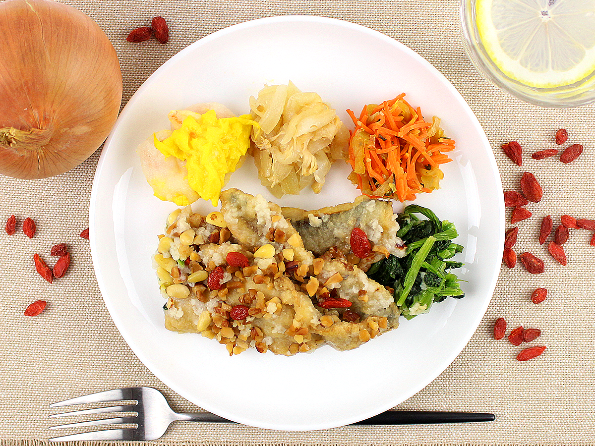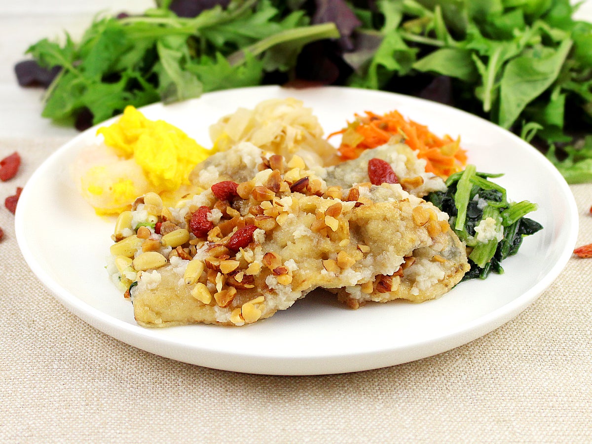 アジのから揚げにペースト状のライスソースをかけてナッツとクコの実をあしらいました。中華料理のトッピングのイメージが強いクコの実は、古くは楊貴妃も好んで食べたといわれています。今ではスーパーフードの「ゴジベリー」と呼ばれています。