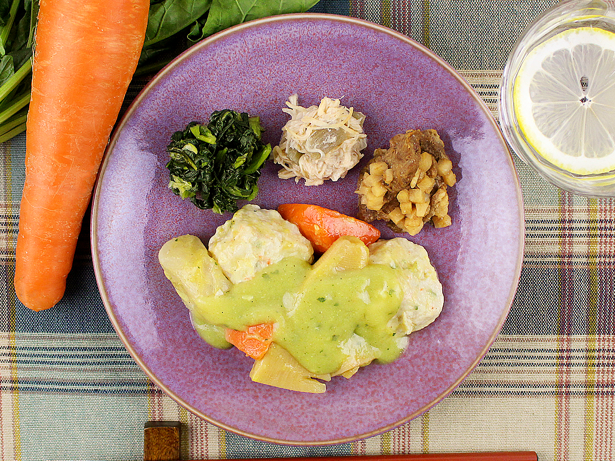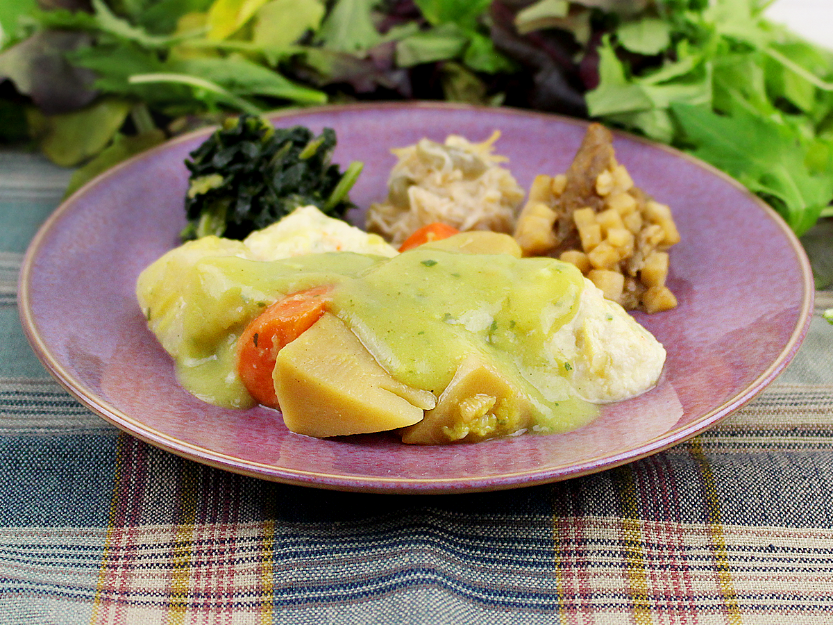 白身魚と豆腐のつみれ、春の筍を木の芽味噌餡でご用意いたしました。山椒の若芽である木の芽は、柑橘類の様な爽やかな香りが特徴で、山椒特有のかすかなスパイス感が食欲をそそります。爽やかな黄緑色の木の芽味噌に少量の練りごまを加え濃厚さをプラスいたしました。
