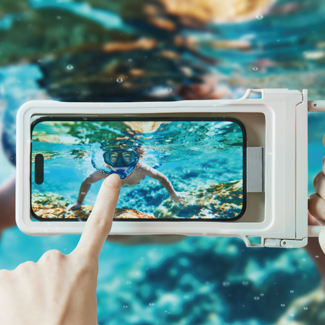 スマートフォン操作画面と防水ケース操作用窓の間に空気の層を作り、水中でもタッチ操作やカメラ撮影が可能です。
