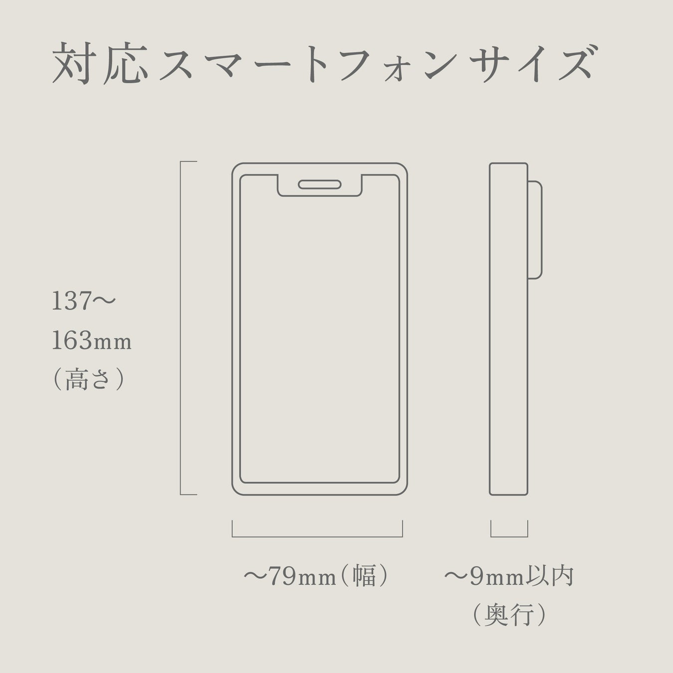 高さ137~163×幅79×厚さ9mm以内のスマートフォンでご使用いただけます。