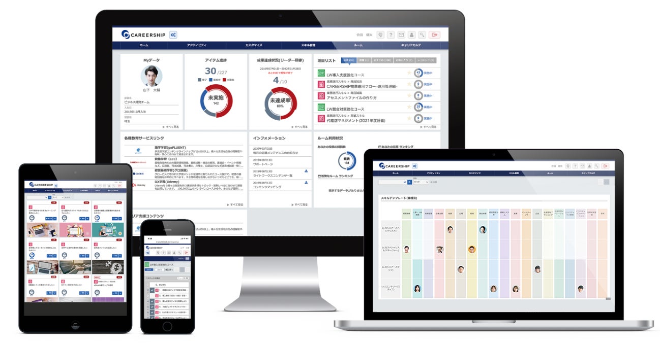 これらの要件を満たし、総合的な課題解決に最適なサービスと評価されたことから、全従業員の学習プラットフォームとしてCAREERSHIP®が採用され、さらに、300タイトル1000本以上のeラーニング教材を学習できるeラーニング受け放題サービス「まなびプレミアム」が同時に導入されました。