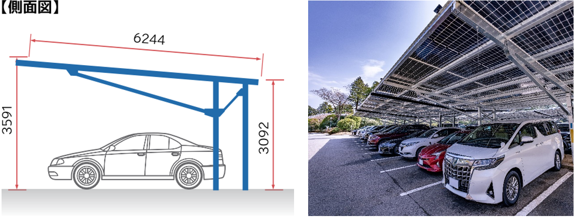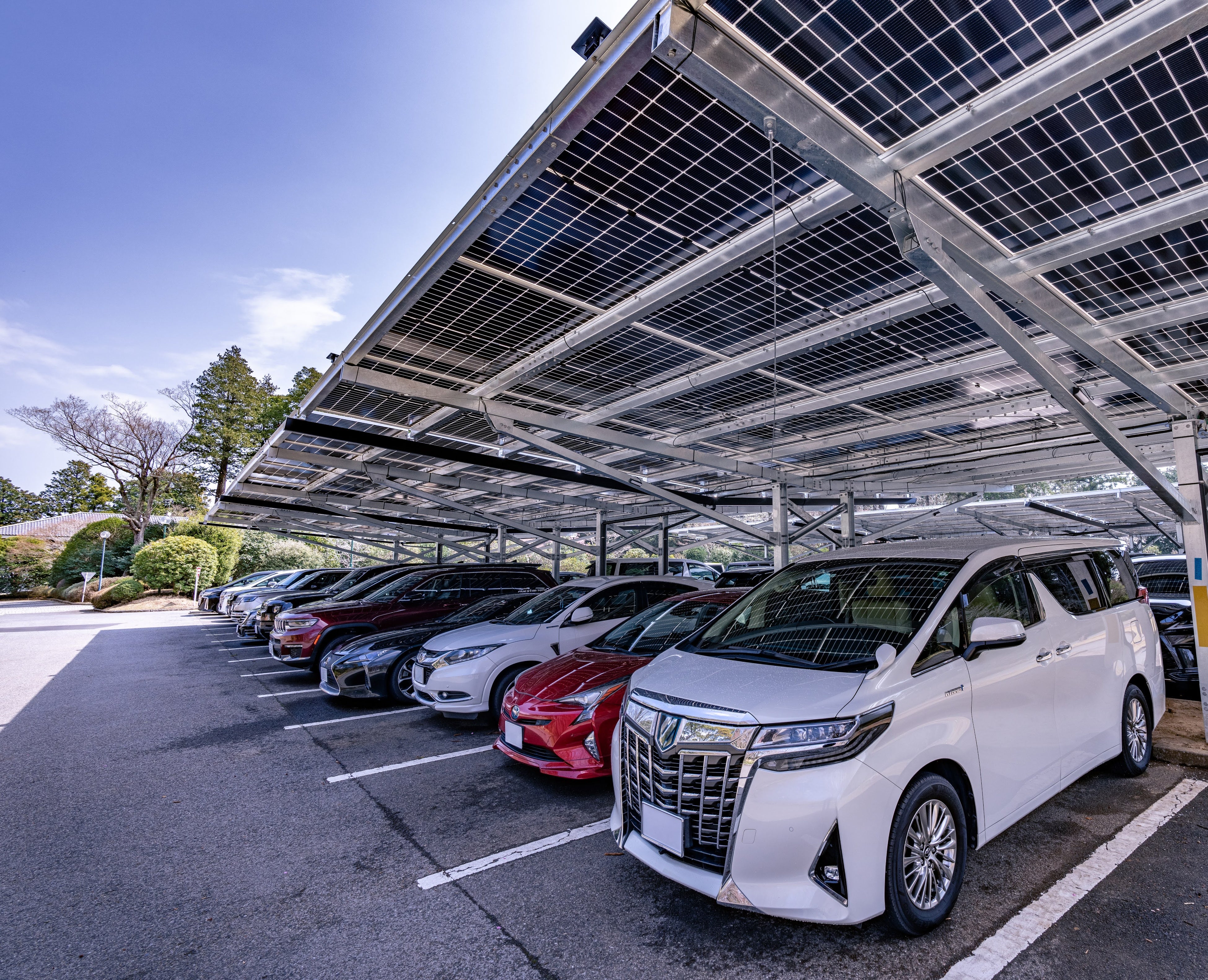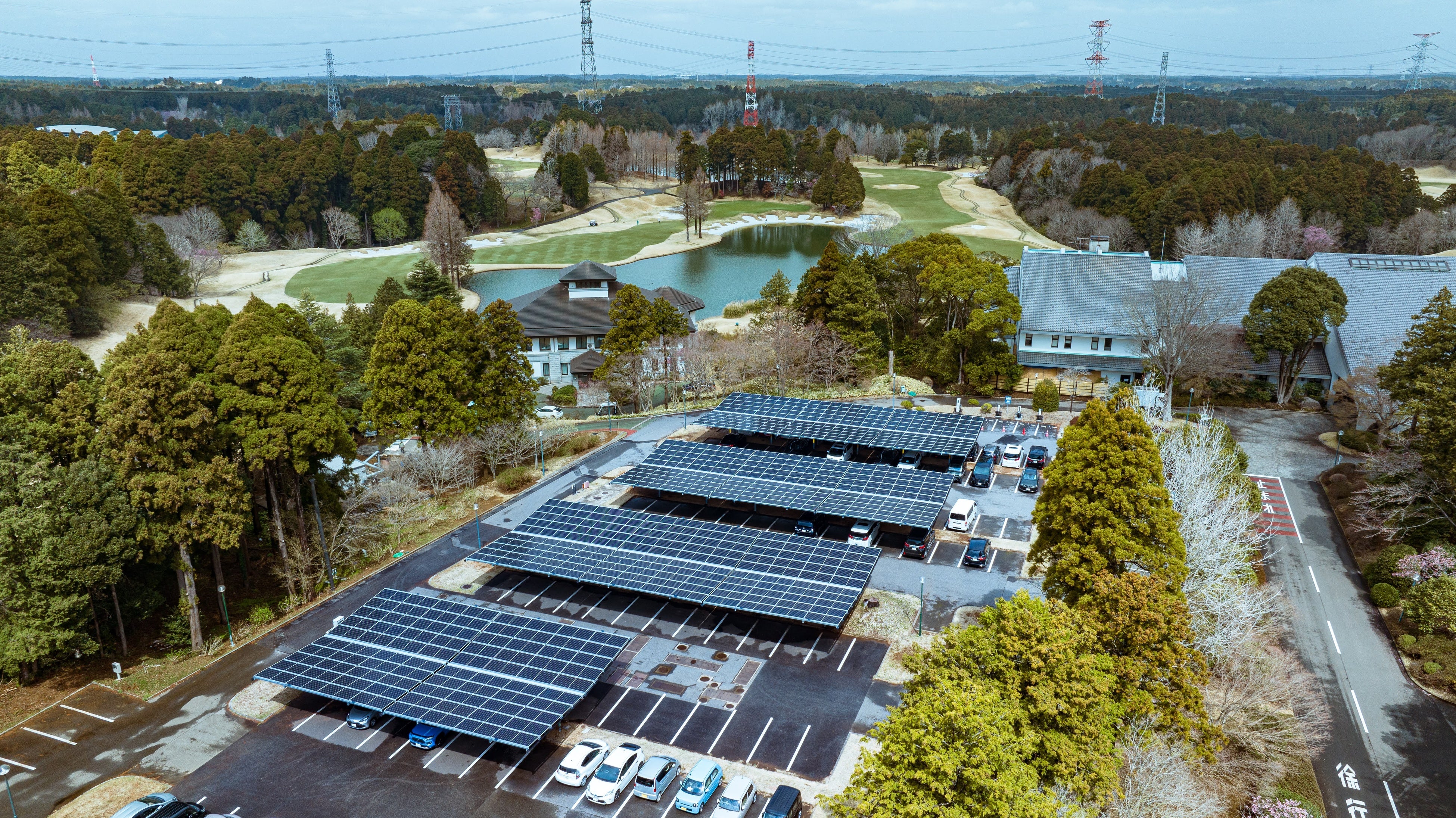 ハイルーフにも対応可の最大高3.6m。しろくま電力(旧afterFIT)のソーラーカーポートをカレドニアン・ゴルフクラブに設置