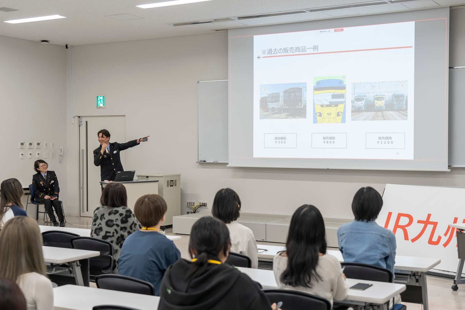 メディア発表会当日は博多駅副駅長の刀根明子様と助役の山下翔様にお越しいただき、企画概要の説明とWebサイトを利用した作品の紹介が行われました。また、質疑応答の時間では学生から活発な質問が寄せられました。
